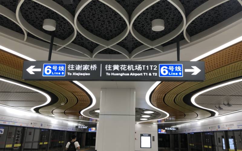 長沙軌道交通6號線線路起于謝家橋站,途經(jīng)長沙市岳麓區(qū)、開福區(qū)、芙蓉區(qū)、雨花區(qū)、長沙縣,止于黃花機(jī)場東站,大致呈東西走向。線路全長52千米,共設(shè)置車站34座,平均站間距為1.44千米,全部為地下車站;列車采用6節(jié)編組A型列車。